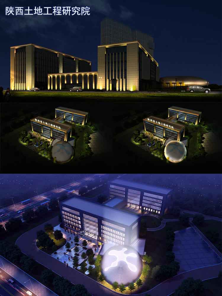 簡介—— 陜西土地工程研究院是承擔(dān)各類建設(shè)工程勘察、設(shè)計、土建、安裝、市政、石化、公路、地鐵、機場、礦山、核電、裝飾、鋼結(jié)構(gòu)、古建園林工程施工。對于設(shè)計院辦公樓體亮化設(shè)計,公司設(shè)計師跟根其前后樓體的建筑和廣場的球狀建筑的特點,采用簡單的洗墻燈和投光燈來進(jìn)行效果設(shè)計,彰顯建筑的大氣與威嚴(yán)。