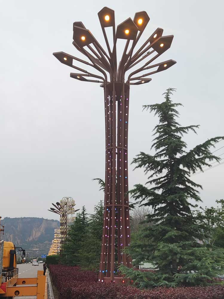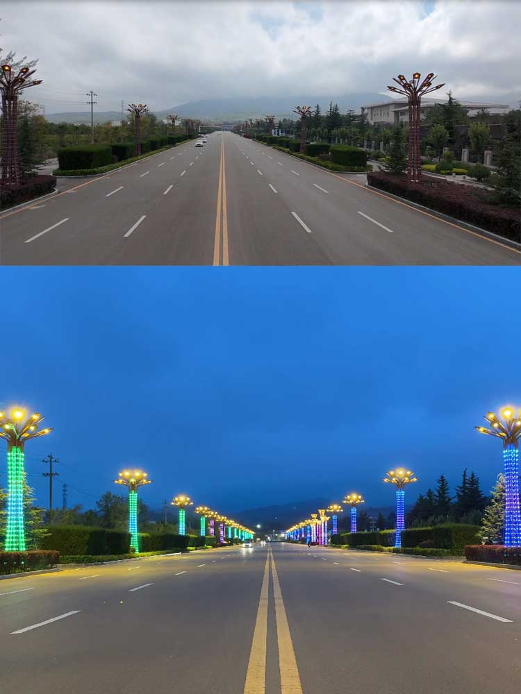甘肅平?jīng)?米景觀燈項目,安裝位于崆峒山下的市政道路倆側,主光源采用16個LED模組光源組成,配合燈體400的RGB點光源構成,系統(tǒng)采用512控制,夜晚整體趁現(xiàn)炫彩效果,亮化倆側道路。