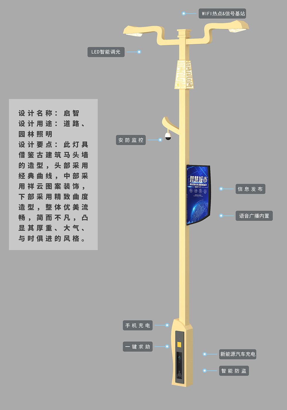 設(shè)計(jì)要點(diǎn):此燈具借鑒古建筑馬頭墻的造型,頭部采用經(jīng)典曲線,中部采用祥云圖案裝飾,下部采用精致曲度造型,整體優(yōu)美流暢,簡(jiǎn)而不凡,凸顯其厚重、大氣、與時(shí)俱進(jìn)的風(fēng)格。
